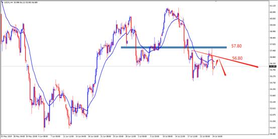 交易策略:建议激进投资者可考虑56.80附近做空,止损58.00附近,目标55.00附近。