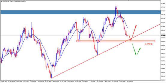 技术点评:H4周期中,受美元反弹影响,澳元短线价格加速下挫,或试探前期水平支撑位0.6960附近。