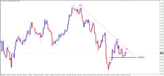 交易策略:激进的投资者可考虑0.9820附近做多,止损0.9780附近,目标0.9900附近。