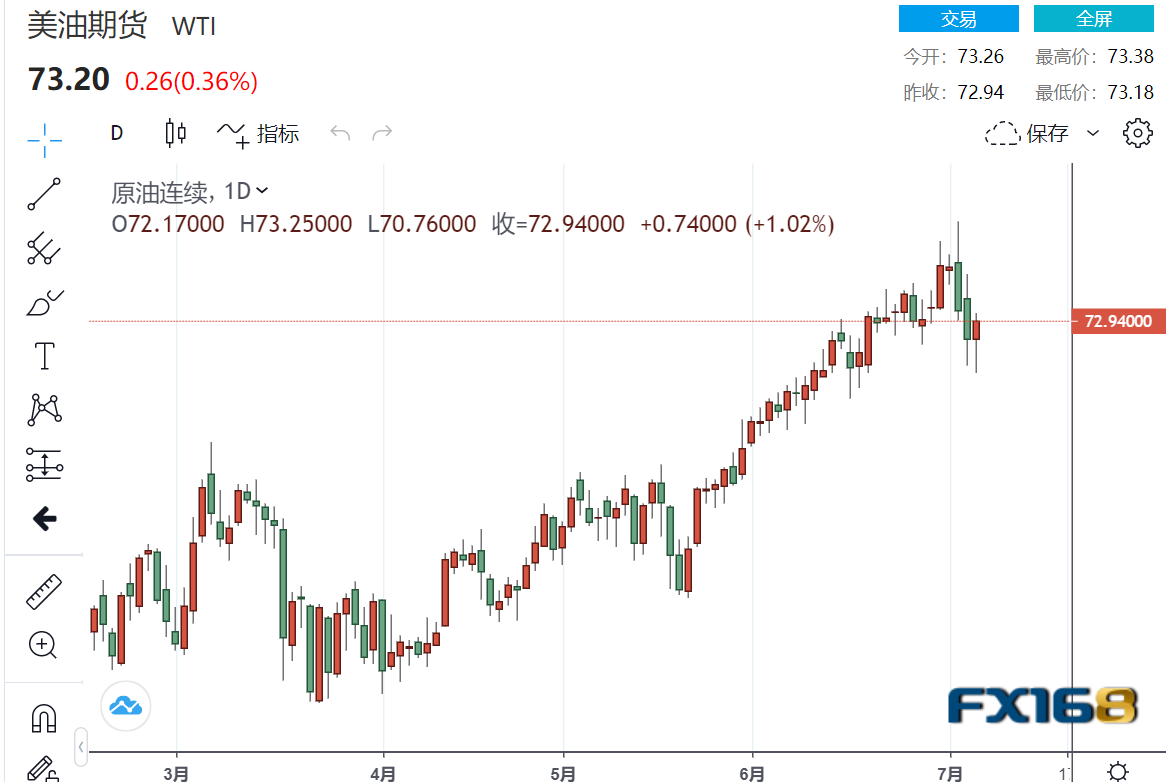 FX168财经报社(北美) 因欧佩克+僵局带来的不确定性,以及对新冠病毒变种迅速蔓延的担忧令市场承压,油价此前连续第三个交易日下跌。周四(7月8日),两大原油期货在美国能源署信息署发布周报后双双反弹。截至发稿,美国WTI原油8月期货上涨74美分,涨幅1.02%,收于72.94美元/桶;布伦特9月期货上涨69美分,涨幅0.94%,报74.12美元/桶。