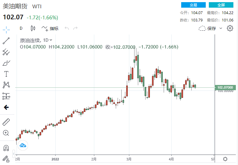 截至发稿,美国WTI原油期货下行2.31美元,跌幅2.22%,现报101.68美元/桶;布伦特原油期货下探2.59美元,跌幅2.38%,报106.10美元/桶。