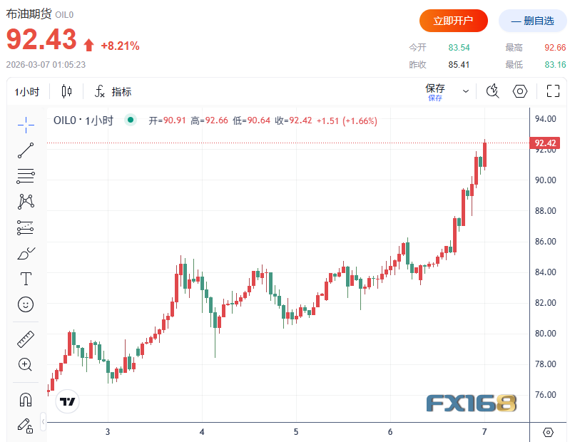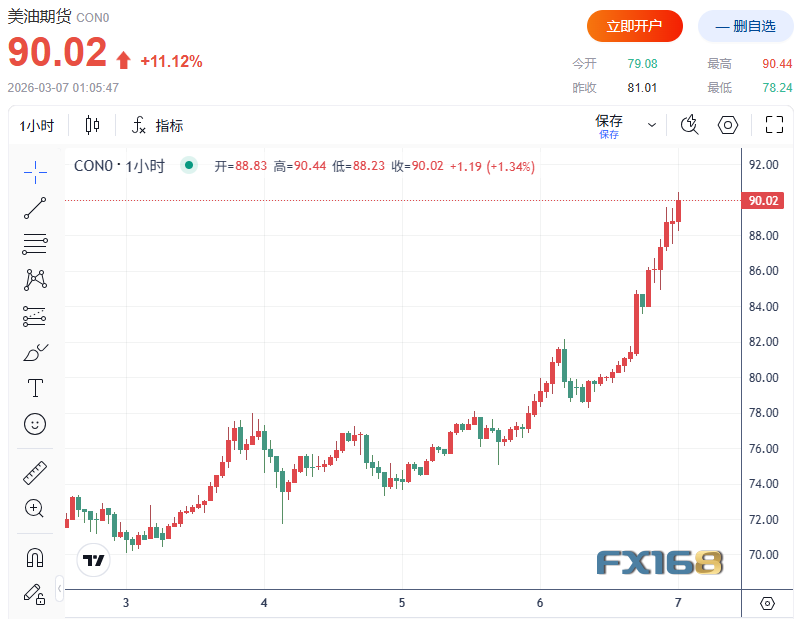 FX168财经报社(北美)讯 随着中东冲突持续升级并迅速冲击全球能源供应链,国际油价周五大幅飙升。全球基准布伦特原油期货近两年来首次突破90美元/,市场担忧霍尔木兹海峡航运几乎停摆将严重扰乱全球石油供应。本周油价累计涨幅已超过20%,成为近年来最剧烈的上涨之一。