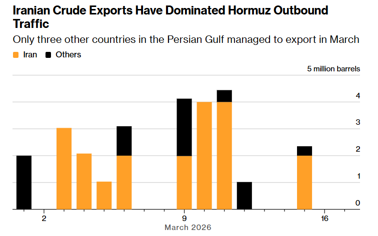 海事分析公司Kpler Ltd.的数据显示,自3月1日以来,离开波斯湾的2720万桶原油中,近四分之三是通过该通道出口的伊朗原油。这相当于德黑兰每日约120万桶原油出口,而战前的日均水平约为150万桶。