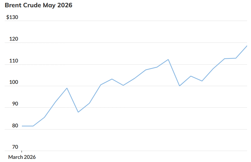 全球基准布伦特原油5月近月合约周二收于每桶118.35美元,在合约到期日上涨4.9%。根据道琼斯市场数据,自1988年有记录以来,布油3月累计上涨63.3%,创下历史最大单月百分比涨幅。周二收盘价也是自2022年6月以来最高水平。美国基准WTI原油5月交割合约周二收于每桶101.38美元。WTI在3月累计上涨51.3%,为2020年5月以来最大单月涨幅。