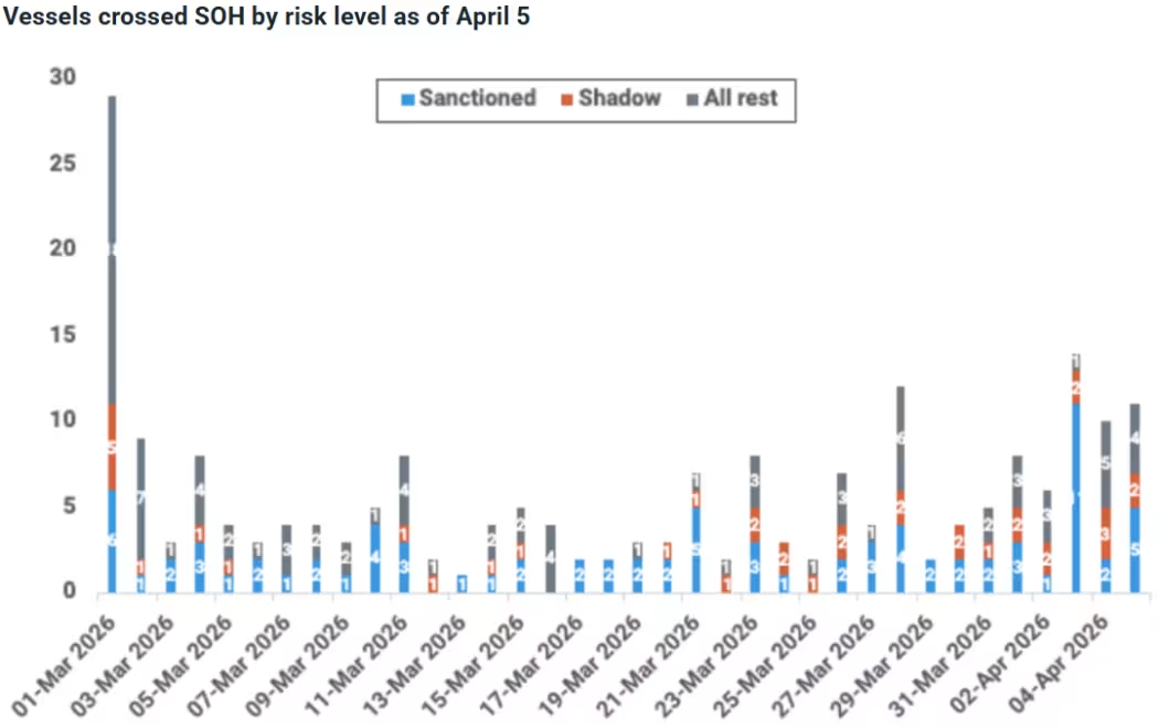 Kpler风险与合规分析师Dimitris Ampatzidis和Yuan Li在周一(4月6日)致客户报告中表示,周末共有21艘船只通过霍尔木兹海峡,其中周六10艘、周日11艘;与2月28日美国和以色列对伊朗发动袭击后海峡通行水平相比,这是一次“明显回升”。