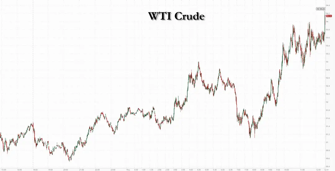 FX168财经报社(北美)讯 一则来自彭博的重磅消息推动油价走高。国际基准布伦特原油6月合约大涨近5%,收于99.39美元/桶;美国WTI原油5月合约上涨近4%,报94.69美元/桶。