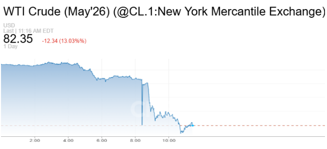 受上述消息影响,美国5月交割的WTI原油期货下跌超14%,至81.22美元/桶低点;国际基准布伦特原油6月合约大跌约13%,至86.37美元/桶。