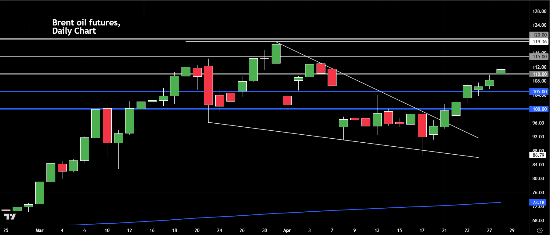 短期来看,交易员仍将焦点放在围绕霍尔木兹海峡的持续紧张局势上。由于存在这种不确定性,原油目前阻力最小的方向似乎仍是上行。布伦特原油现已突破每桶112美元关口,在连续几个交易日买盘推动后进一步扩大涨幅。油价也正逼近中东危机高峰期间所见的高点,这加大了伊朗和美国达成协议、结束僵局的压力。