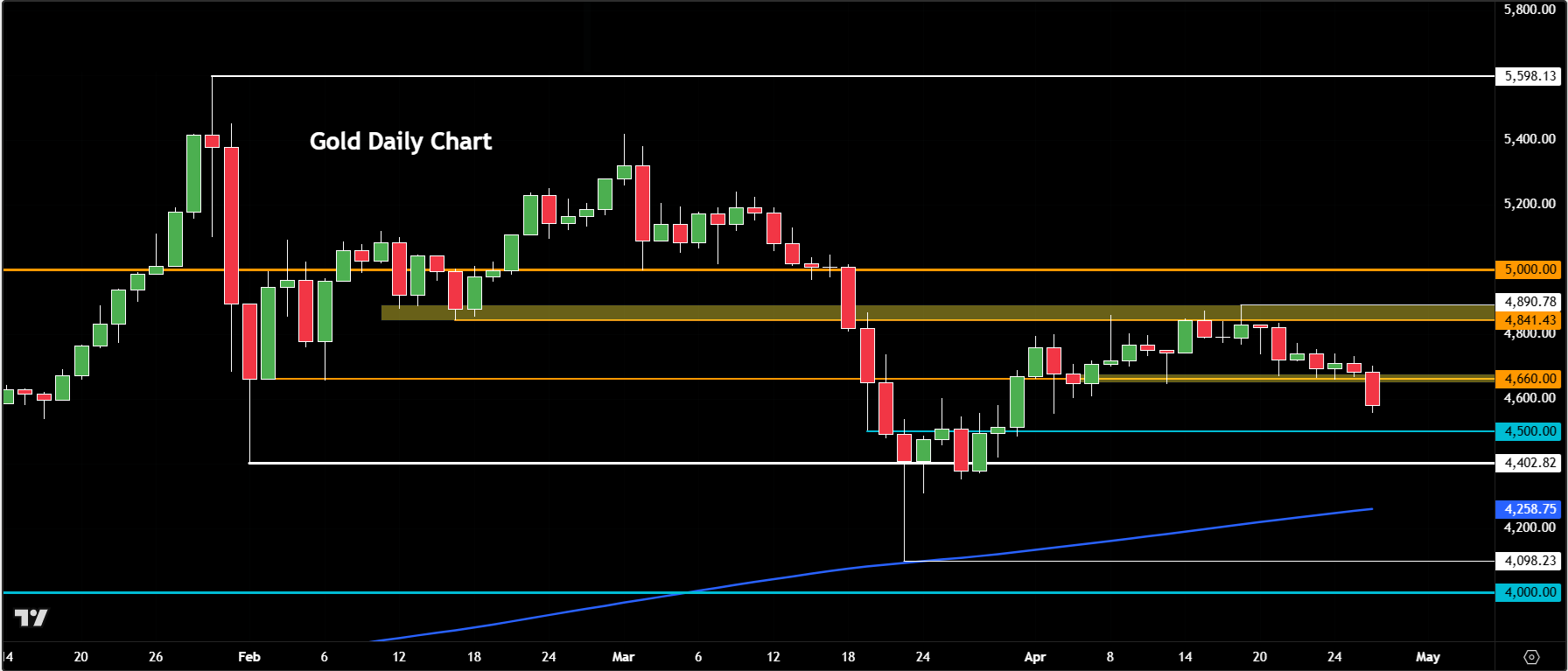 如果抛售压力持续,那么黄金接下来的下行目标可能在4500美元附近,随后是4400美元区域。更长期支撑仍位于4000美元附近。