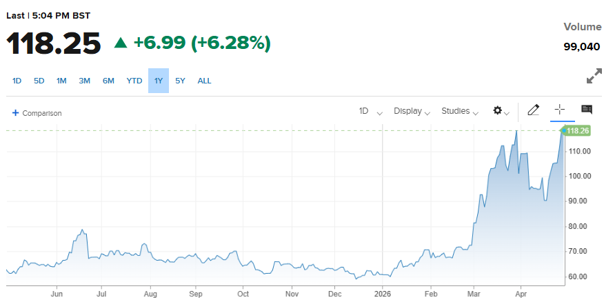 美东时间周三下午,布伦特原油价格升至118美元/桶以上,创下本月以来新高,较周二晚间约110美元的水平明显上涨。